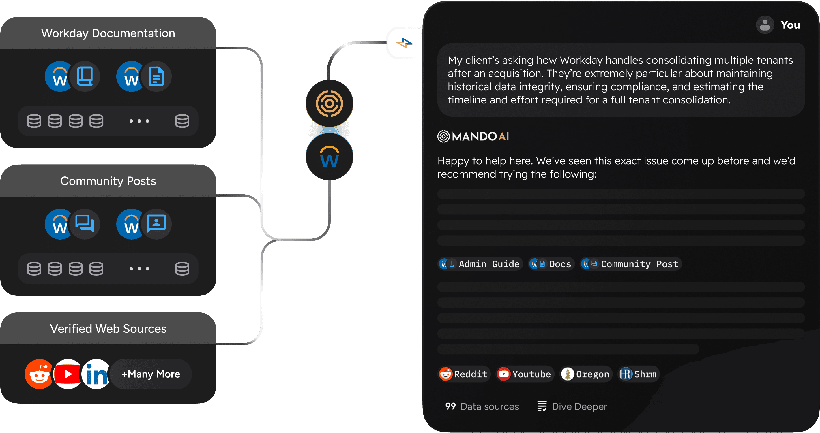 “Admin guides, Brainstorms, the developer forum — Community would always drive us into rabbit holes. Now we just use Mando and can have real confidence in terms of what's possible, instantly. It’s the first tool that actually feels like part of our Workday team.”